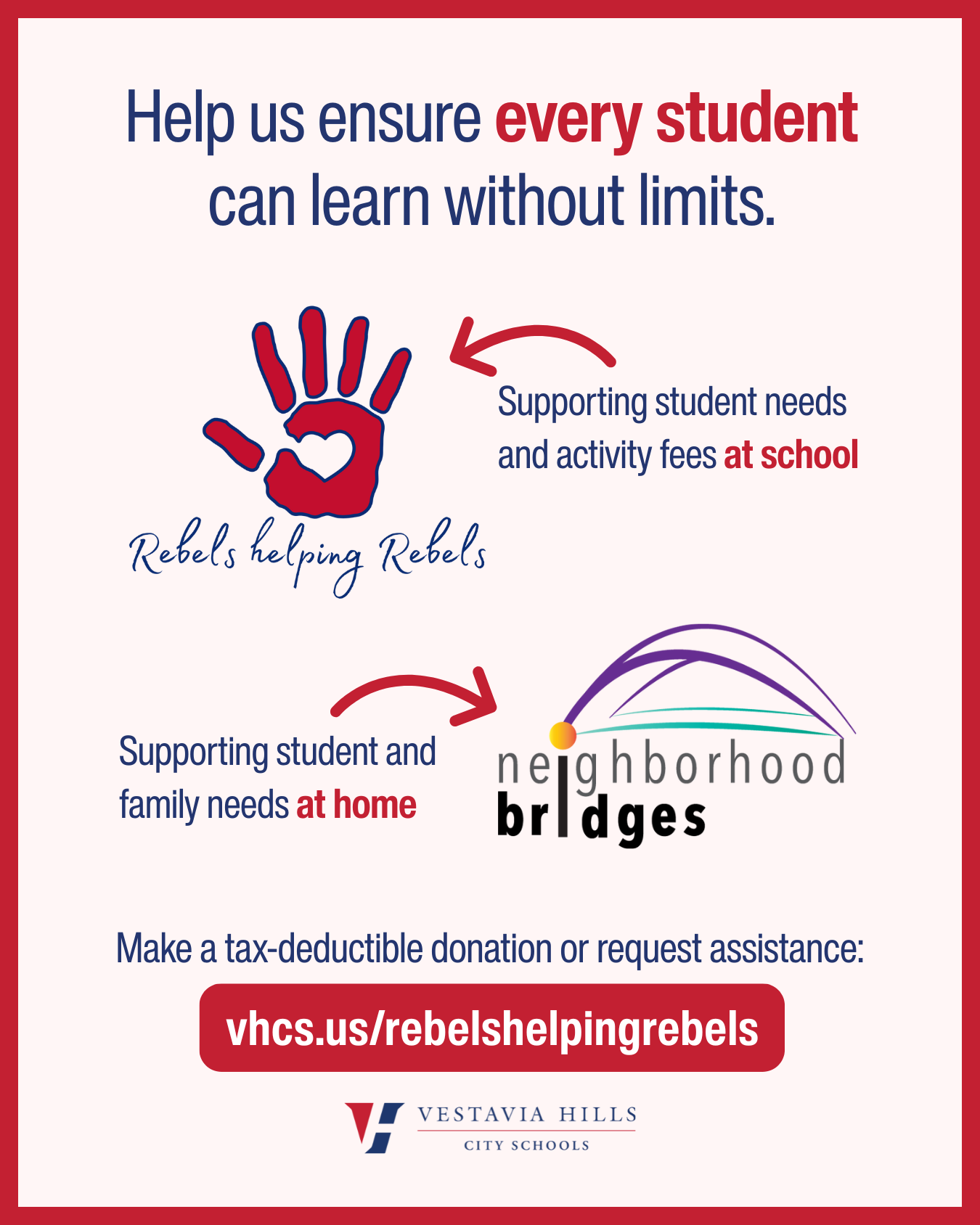 We have two great ways you can support Vestavia Hills students and families in need: Rebels Helping Rebels and Neighborhood Bridges. Learn more about both programs at https://buff.ly/piniP56