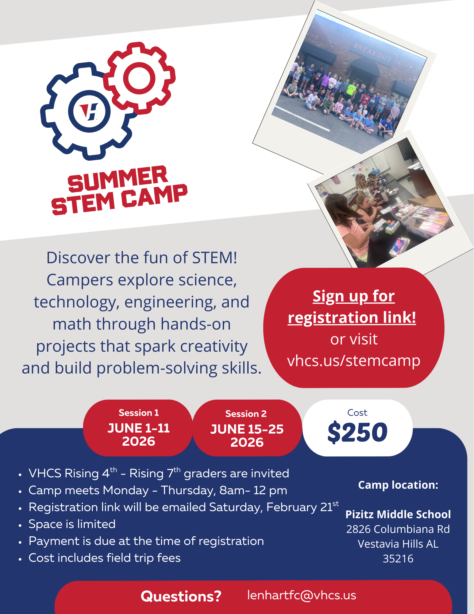 Last call for STEM Camp signup — registration closes Friday, March 13! Signup information: www.vhcs.us/stemcamp